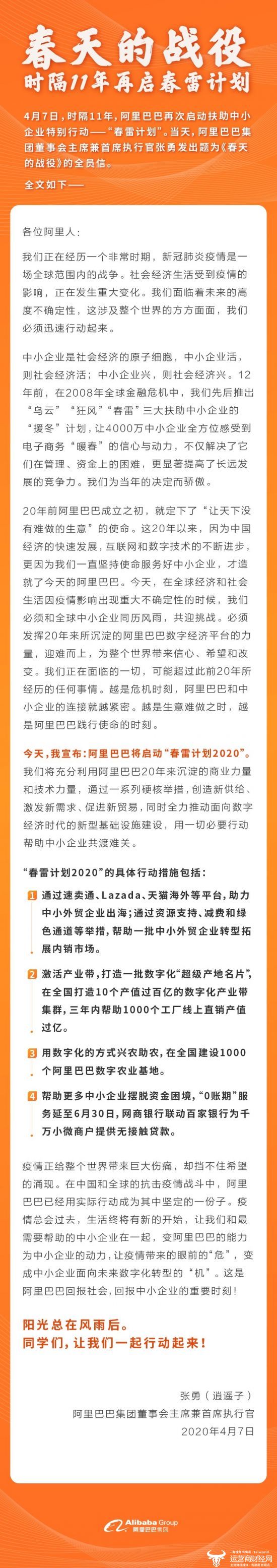 4月7日,时隔11年,阿里巴巴再次启动扶助中小企业特别行动——“春雷计划”。当天,董事会主席兼首席执行官张勇发出题为《春天的战役》的全员信。