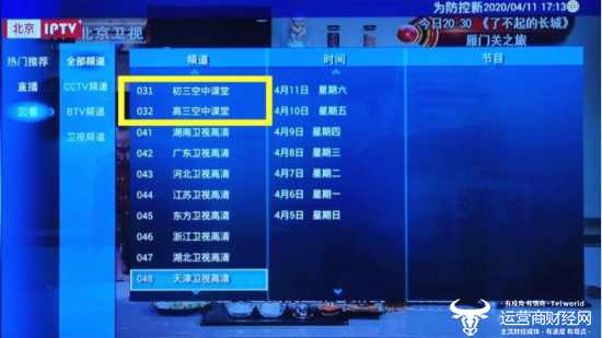 为全力配合北京市教委,近日中国电信北京公司(以下简称北京电信)将北京市中小学线上学科教学内容加入到天翼高清北京IPTV中,学生可在家通过直播、点播等形式开展空中课堂学习,并可实时回看上线课程。如居民家中已安装北京电信宽带及IPTV机顶盒,可通过天翼高清北京IPTV中“北京数字学校”模块实现“空中课堂 ”的直播、回看、点播。