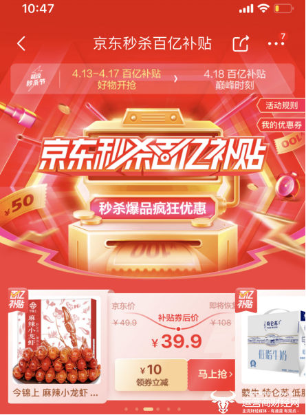 4月13日-17日,秒杀主会场将开启预热,京东各事业部联动,海量大牌爆品集结,各品类争相亮相,18日全品类爆发,惊喜全面来袭!更值得期待的是, 4月13日到18日,京东418超级秒杀节再推超级百亿补贴福利,携手超多低价好货开启狂欢之旅!