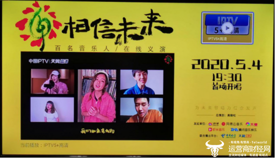《相信未来》在线义演共4场,5月4日、5日已播出2场。本次义演活动主办方4月底才开始筹备组织,但目前已经有超百位明星加盟助阵,演出阵容大牌云集,具有很大的社会影响力。天翼智慧家庭科技有限公司代表中国电信获得此次活动在全国天翼高清平台播出的直播授权,这也是运营商中第一个拿到本次活动官方播出平台的授权。