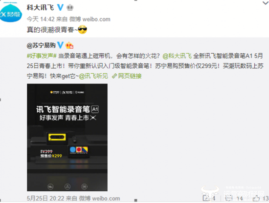 5月25日,苏宁易购官微和科大讯飞官微,共同官宣了一款针对学生记录群体的智能录音笔A1。作为一款超轻便携式录音产品,A1售价399元,将会在苏宁易购官网和苏宁易购天猫旗舰店进行独家预售,是苏宁618期间的一款重要新品。