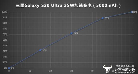 在手机电量基本为零的情况下,使用官方标配的25W加速充电套装为三星Galaxy S20 Ultra进行充电,可以看到,充电15分钟即可将手机充至32%,而30分钟后,手机电量便达到了62%,45分钟电量达到了89%,即便充满5000mAh的整部电池,实际用时也仅59分钟。考虑到三星Galaxy S20 Ultra内置了一块5000mAh的超大电池,这样的快充表现已属非常难得。25W的最大充电功率看起来其貌不扬,实际表现则大大出乎意料。