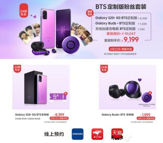 还有更加实惠的包括Galaxy S20+ 5G BTS粉丝定制版、三星Galaxy Buds+ 粉丝定制版、无线加速充电板 BTS定制版捆绑销售的BTS定制版粉丝套装,总计优惠1000元+。BTS的粉丝们,路已指好,速速上车吧!