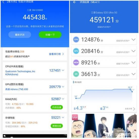 作为三星Galaxy S系列的顶级旗舰,三星Galaxy S20 Ultra毫无疑问搭载了目前最为顶级的硬件配置,无论是最新A77架构的高通骁龙865旗舰级处理器、最新的LPDDR5超快运存,还是高达120Hz的超感官全视屏,都是目前供应链中最为出色的配置,而这样的硬件配置反映到数据上最直接的便是超高的跑分表现。