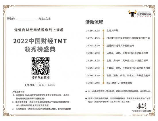 今年召开的2022中国财经TMT领秀榜盛典将于1月20日(周四)14:30正式召开,会议采取线上直播形式举行,观众可通过微信视频号、百度直播、新浪微博直播、联通沃视频直播等平台进行观看,并且直播过程中还设置了多轮千元红包雨以及精美礼品抽奖环节。