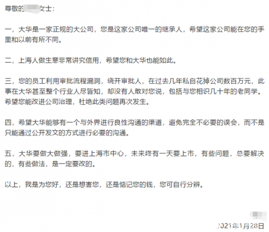 不过,去年的一件事情值得金建明注意。2021年1月,上海大华集团被供应商写实名公开信举报,称大华集团有员工利用审批流程漏洞,绕开审批人,私自获利数百万元。