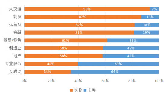 图 1 各大行业企业员工年货福利选择偏好:实物商品vs礼品卡券