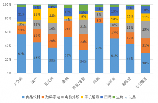 从具体行业来看,食品饮料占各行业全部年货采购的占比依然最高,其中能源和交通行业最喜欢为员工采购食品饮料类商品作为年终春节福利,占比达到73%和57%。相比之下,金融及贸易零售行业则更多选择数码家电产品作为福利的,占比在24%左右。