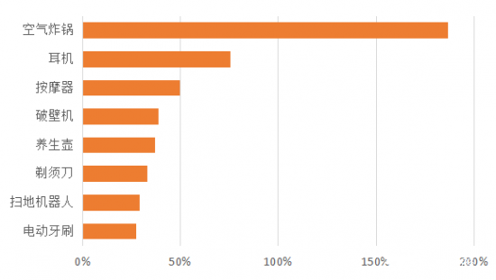 相比以上经典的年货选项,潮流厨电、数码产品及健康产品等新兴品类和商品则是企业年货福利选择的“新宠”,增长较为明显。其中,今年京东年货节期间,京东企业业务的空气炸锅的销售额同比增长达186%,耳机/耳麦同比增长超过75%,而按摩器、破壁机则增长了近50%。