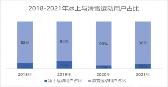 京东消费情况显示,在冰与雪之间,滑雪用户的群体占比更大,并且保持逐年缓慢上升的趋势。在所有冰雪运动用户中,占比从2018年的占比88%,提升至2021年的90%。