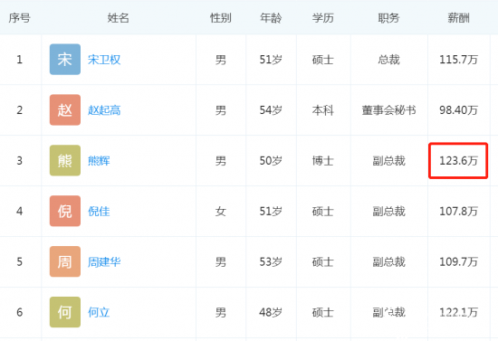 财报数据还显示,2020年熊辉年薪123.6万,超过总裁宋卫权的115.7万;副总裁倪佳、周建华、何立,2020年年薪分别为107.8万、109.7万和122.1万,熊辉在一众副总裁之中,是年薪最高的。