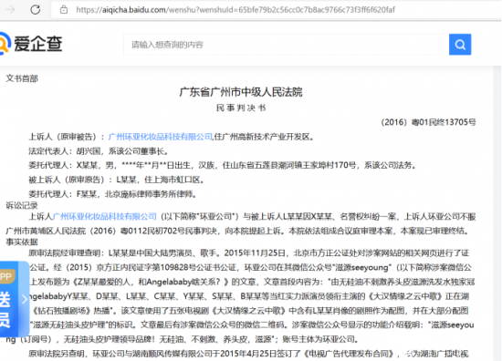 其中显示,环亚集团曾在2016年被某知名男演员L某某告上法庭,原因是“环亚公司将L某某的肖像用于化妆品上,让人误认为L某某使用了环亚公司的产品,降低了L某某的社会评价”,