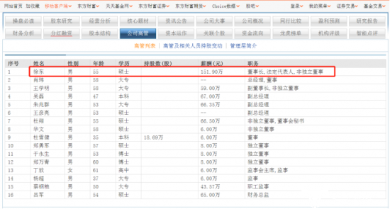 公司官网显示,徐东出生于1967年,毕业院校不详,获EMBA硕士学位。