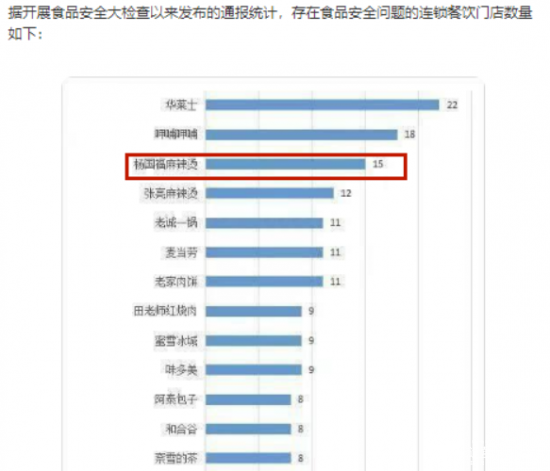不过,2021年12月,北京市消费者协会针对食品安全问题通报,整理了存在食品安全问题的企业名单。其中,杨国福麻辣烫又因为门店存在食品安全问题上榜。