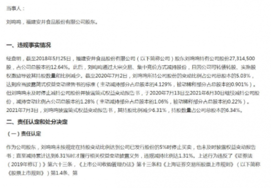 决定书显示,截至2018年5月25日,安井食品股东刘鸣鸣持有公司股份2731万股,占公司总股本的12.64%。此后,刘鸣鸣通过大宗交易、集中竞价方式减持股份,且因公司可转债转股、实施股权激励导致其持股数量和比例减少。