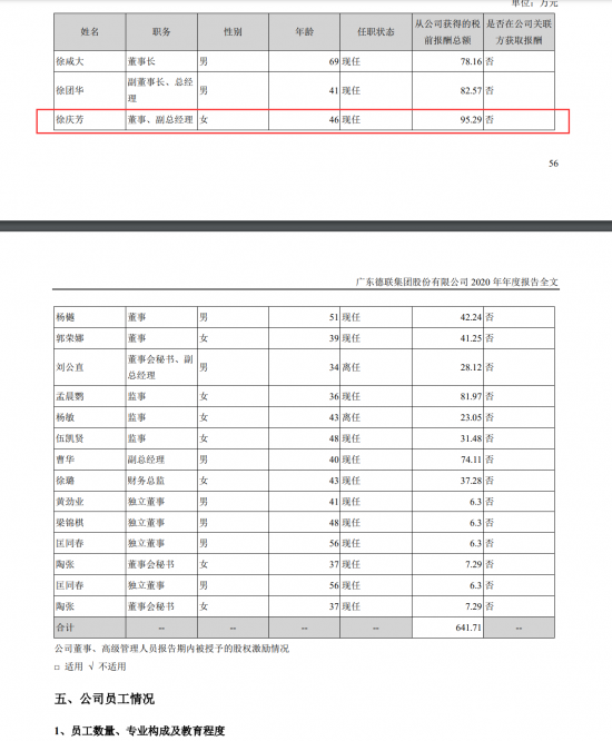 早前,徐庆芳曾在佛山市南海国际投资公司财务部就任过,后来,她便加入了德联集团。据德联集团2020年年报显示,徐庆芳2009年时就出任为了公司董事和副总经理,而那一年,她也才35岁。如今,徐庆芳依旧担任该职。