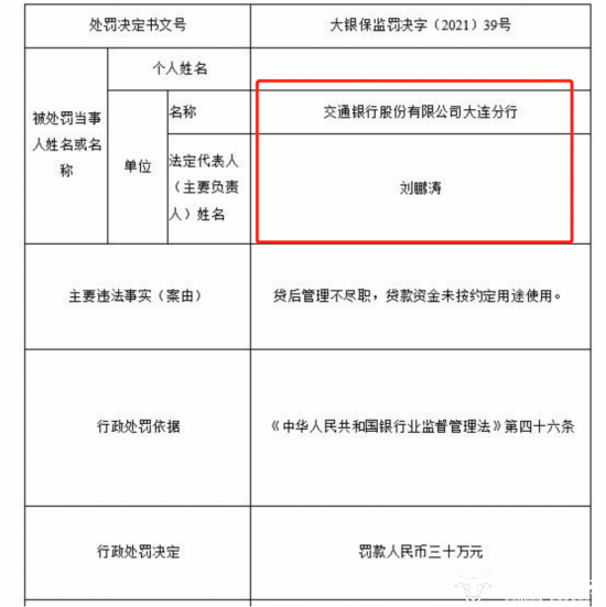 2021年8月23日,交行大连分行因贷后管理不尽职,贷款资金未按约定用途使用被中国银保监会大连监管局罚款30万元。