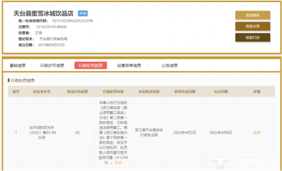 根据国家企业信用信息公示系统显示,浙江省台州市天台县蜜雪冰城饮品店因违法使用童工,被天台县综合行政执法局罚款1.25万元。