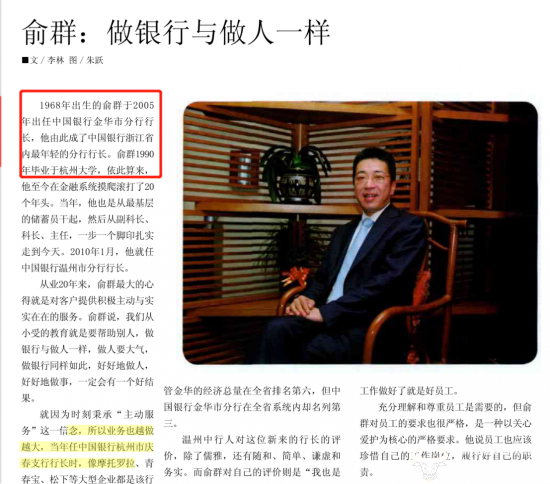 2005年的时候,俞群37岁,已经是中行金华市分行的行长,他也由此成为了中国银行浙江省内最年轻的分行行长,而他也在任职的5年间,做出了很好的成绩,金华分行的存贷款总额从80多亿增长为300多个亿。当时中行金华市分行在全省系统内名列第三。