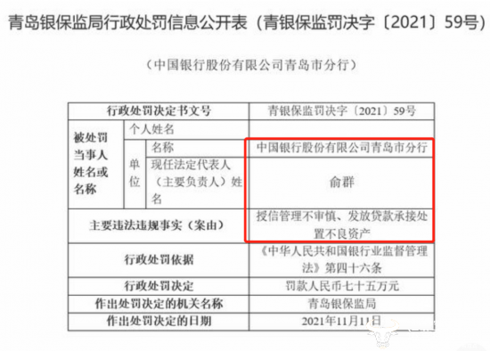 截至目前,俞群来到中行青岛分行有近两年时间了,这两年时间里,中行青岛分行曾在2021年11月11日因授信管理不审慎、发放贷款承接处置不良资产被青岛银保监局罚款75万元,这是俞群在任期间出现的贷款业务的问题。