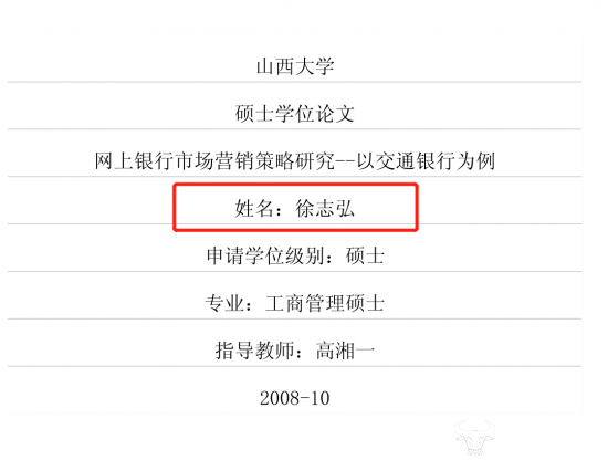徐志弘之前是在山西工作,她也在山西大学攻读了工商管理硕士,不过她应该是属于在职硕士的类型,2008年硕士毕业,徐志弘的硕士学位论文是《网上银行市场营销策略研究——以交通银行为例》,文章中从营销理论出发对交行网上银行的外部宏观环境、行业竞争环境以及内部竞争力因素三方面进行了深入的分析;从交行网上银行的营销环境特点出发对消费者行为特征等进行了分析并得出交行网上银行的目标市场决策,并进一步细化从产品、价格、渠道、促销四个层面提出了组合策略。