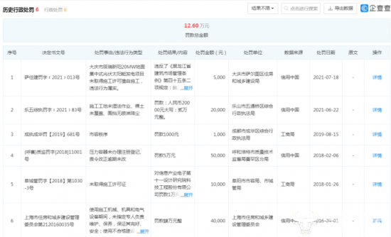 值得注意的是,孙鸿伟掌管的这几家子公司行政处罚可不少,光是信息产业电子第十一设计研究院科技工程股份有限公司在企查查上就有6条处罚记录,多是施工不合格或环境违法,罚款总金额12.6万。另外几家子公司也有环境违法的行政处罚记录。