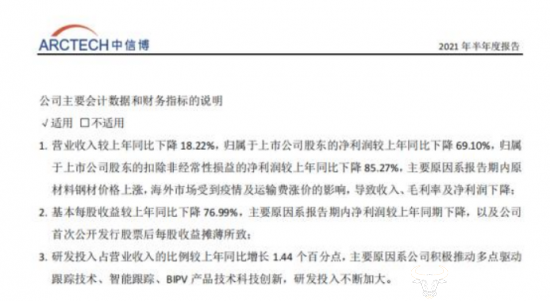 作为光伏支架的龙头企业,中信博财报数据引起业内的广泛关注,其实,此前中信博在半年报中提出过业绩下滑的原因,系报告期内原材料钢材价格上涨,海外市场环境的影响,导致收入、毛利率及净利润下降。