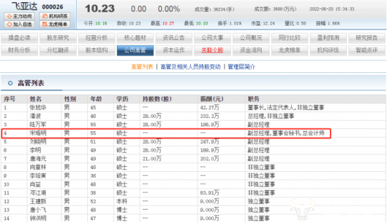 宋瑶明自2022年2月6日担任飞亚达总会计师,现还同时兼任董事会秘书与副总经理。