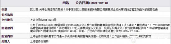 根据上证公函[2021]2713号,歌力思于2021年8月28日披露拟终止2015年首次公开发行股票的募集资金投资项目“VIVIENNETAM品牌营销渠道建设项目”并将剩余1.12亿元募集资金永久补流,及拟延长首次公开发行股票募投项目“IRO品牌营销渠道建设项目”的建设完成日期至2021年4月,目前,上述两个项目建设进度分别为8.86%、17.34%。对此,上海证券交易所要求公司进一步说明并补充披露有关信息,现对《工作函》相关问题回复和披露。