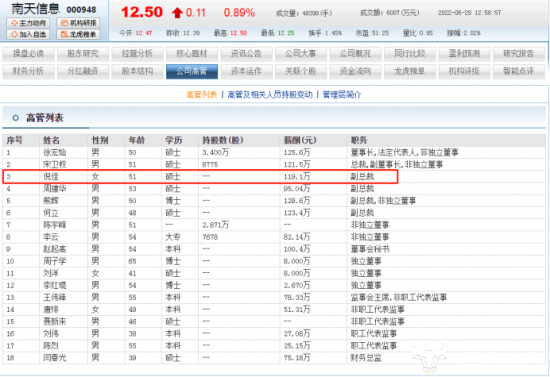 据东方财富网数据显示,倪佳在南天信息的薪酬为119.1万元,而高管中薪酬最高的为同为副总裁的熊辉,为129.6万元。可见倪佳的薪酬还是比较高的。
