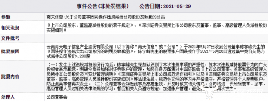 南天信息在营收增长的同时也出现过一些问题。2021年5月29日,南天信息董事会发布了一则关于公司董事因误操作违规减持公司股份及致歉的公告。