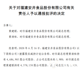 同年12月,上交所公布关于对福建安井食品股份有限公司有关责任人予以通报批评的决定。