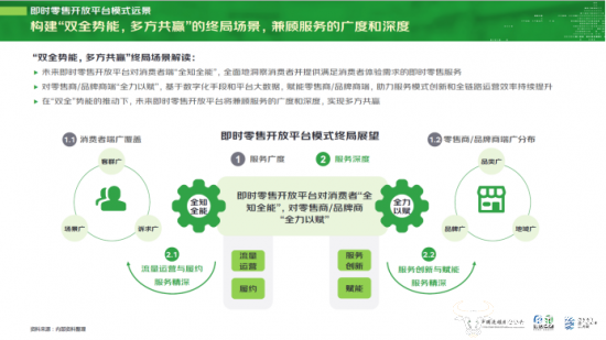报告展望开放平台模式远景,将呈现消费侧“客群广、场景广、诉求广”,供给侧“品类广、品牌广、地域广”特征,参与各方在流量、履约、服务创新和赋能的合作上持续深化,即时零售开放平台将兼顾服务广度和深度,实现多方共赢。