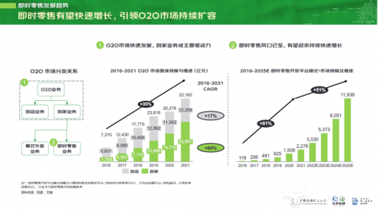 白皮书指出,O2O到家业务成为近年来零售行业重要驱动力,2016-2021年的年复合增长率达到64%。作为O2O到家业务重要组成部分,即时零售风口已至,迎来快速增长。其中平台模式2016-2021年的年复合增长率为81%。预计到2025年,即时零售中的开放平台模式规模将突破万亿门槛,达到约1.2万亿元,引领并拉动O2O整体市场规模增长。