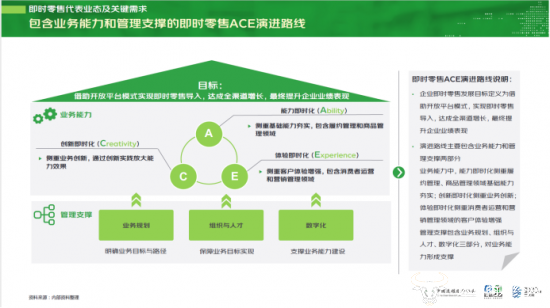 结合达达和京东7年来与实体零售商、品牌商的即时零售合作实践经验沉淀,报告创新性总结出即时零售ACE制胜演进路线,包含能力即时化(Ability)、创新即时化(Creativity)和体验即时化(Experience)的业务能力,以及业务规划、组织与人才、数字化等管理支撑。目标是让零售商和品牌商借助开放平台模式,实现即时零售导入,达成全渠道增长,最终提升企业业绩。