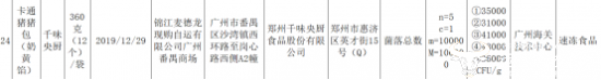 2020年6月5日,广州市政 府官网发布《广州市市场监督管理局2020年第13期食品安全监督抽检信息》,其中千味央厨的卡通猪猪包(奶黄包)菌落总数被检出不合格。