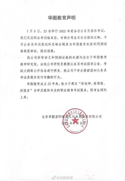 就此次问题,华图教育发布声明表示:华图教育所有讲义和预测试卷的来源均出自于华图教育教学研究院,由华图教育研究员根据公务员考试招录公告、考试大纲等公开信息进行研发,华图教育不存在提前获知公务员考试真题并进行传播的行为。