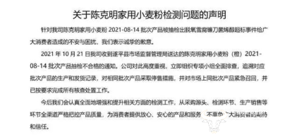 2022年1月6日,“陈克明食品”微信号发布声明承认此事,称“针对公司陈克明家用小麦粉2021-08-14批次产品被抽检出脱氧雪腐镰刀菌烯醇超标事件给广大消费者造成的不安与困扰,我们表示诚挚的歉意”。