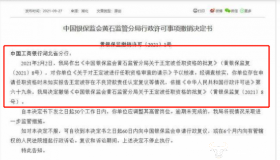 2021年9月27日,中国银保监会黄石监管分局发布了一则行政许可事项撤销决定书,据显示,2021年2月2日,该局作出《中国银保监会黄石监管分局关于王定波任职资格的批复》(黄银保监复〔2021〕8号),对《关于对王定波进行任职资格审查的请示》予以核准。经调查核实,你单位存在申请任职资格时未如实报告王定波存在不良贷款责任认定复议等情况,最终决定撤销此批复。也就是说,王定波不能当工行湖北黄石分行副行长。