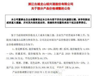 该公告称,鉴于当前原材料价格及人工成本大幅上涨,企业生产经营成本不断上升,为提高古越龙山品牌力和竞争力,公司决定对部分产品价格进行调整。