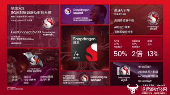 在连接方面,第二代骁龙7+集成了骁龙X62 5G调制解调器和射频系统,最高下行速率达到了4.4Gbps,并首次支持了5G+5G/5G+4G双卡双通功能,在Wi-Fi/蓝牙上支持了Wi-Fi 6/6E,并支持2x2+2x2的四路双频并发,把覆盖范围和速率都提升了2倍。