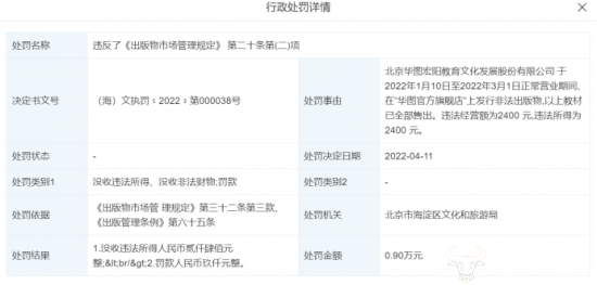 据2022年4月11日,北京市海淀区文化和旅游局行政处罚决定书显示,北京华图宏阳教育文化发展股份有限公司于2022年1月10日至2022年3月1日正常营业期间,在“华图官方旗舰店”上发行非法出版物,以上教材已全部售出。共涉及违法经营额为2400 元,违法所得为2400 元。