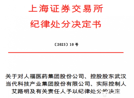 上交所决定对人福医药控股股东,武汉当代科技产业集团实际控制人艾路明等一系列人员予以公开谴责,并公开认定艾路明3年内不适合担任上市公司董事、监事和高级管理人员,对人福医药时任董事长、总裁李杰等一系列人员予以通报批评。