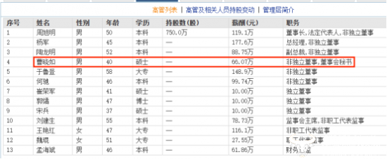 值得一提的是,东方财富网信息显示,曹晓如曾获得的薪酬为66.07万元,从公司整体的薪酬水平来看,他的薪酬不算高。另外,在高管团队中,曹晓如是比较年轻的一位高管,他今年40岁。