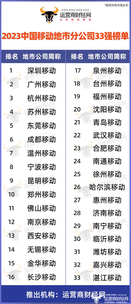 据悉,此次“2023中国移动地市分公司33强榜”排名依据是以一年的营收数据等为硬性指标,仅选取前33名的地市分公司进行排名。而能够入选的均是中国移动旗下规模较大的地市分公司。