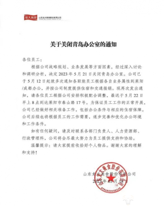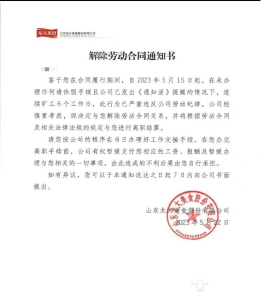 有媒体报道称,今年5月,龙大食品突然整体关闭青岛办公室,员工质疑被变相裁员。有员工晒出收到的《解除劳动合同通知书》,其中称,鉴于您在合同履行期间,自2023年5月15日起,在未办理任何请休假手续且公司已发出《通知函》提醒的情况下,连续旷工6个工作日,此行为已严重违反公司劳动纪律,公司经慎重考虑,现决定与您解除劳动合同关系,并将根据劳动合同及相关法律法规的规定与您进行离职结算。