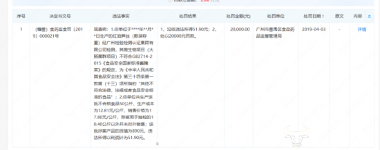 值得注意的是,公司旗下的全资控股子公司广州川沁食品有限公司曾因生产的食品不合格受罚。其原因是公司生产的红油笋丝内的大肠菌群项目不符合GB2714-2015《食品安全国家标准酱腌菜》的规定,因此被广州市番禺区食品药品监督管理局处以两万元罚款。