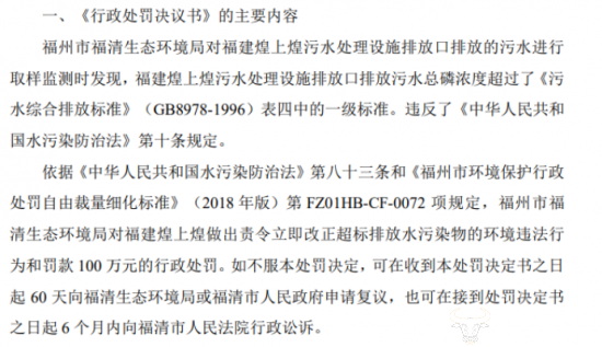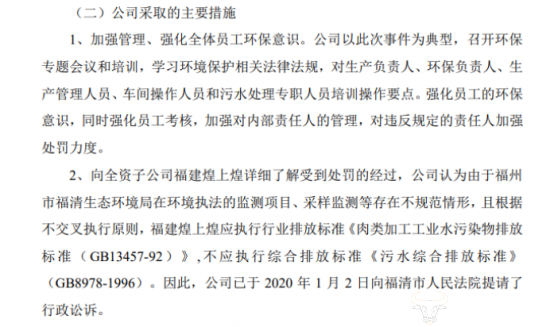 值得注意的是,公司旗下子公司福建煌上煌食品有限公司曾收到福州市福清生态环境局环保部门行政处罚决定书。决定书表明,该生态环境局对福建煌上煌污水处理设施排放口排放的污水进行取样监测时发现,福建煌上煌污水处理设施排放口排放污水总磷浓度超过了《污水综合排放标准》(GB8978-1996)表四中的一级标准。违反了《中华人民共和国水污染防治法》第十条规定,因此对该公司做出责令改正行为和100万元罚款。