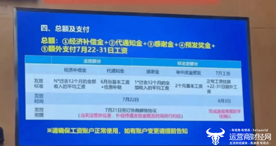 补偿金发放前提为“在7月21日签订协商解除协议,在8月3日前完成退宿等离职手续确认”。