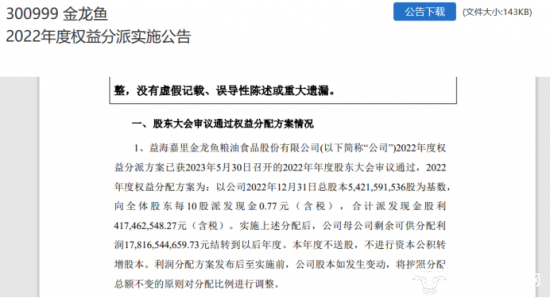 此前,金龙鱼发布2022年度的权益分配方案,公司拟以每10股派发0.77元现金,分红现金总额达到了4.17亿元,这个分红力度在上市公司当中算是比较小的。